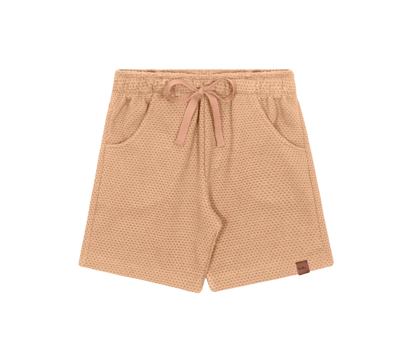 Bermuda para menino, confeccionada em meia malha maquinetada em bege / caramelo, com bolsos faca frontais e detalhe em cadarço de algodão. Possui cintura com elástico confortável e ótimo caimento. Ideal para compor looks descolados no verão.