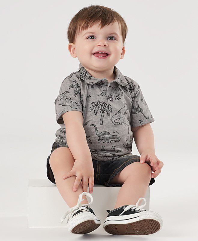 Camisa infantil gola polo estampada com dinossauros em preto. Confeccionada em meia malha de algodão cinza, é confortável e com ótimo caimento. Possui etiqueta da marca em laranja neon na bainha.