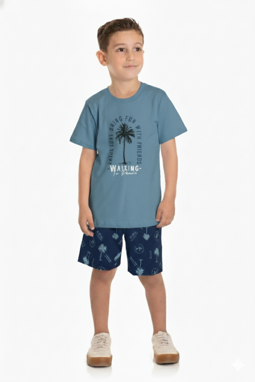 Conjunto para menino, composto por camiseta azul com estampa de coqueiro e bermuda em microfibra (estilo tactel) azul marinho com cintura de elástico confortável estampada com coqueiros. A camiseta possui manga curta e gola redonda, confeccionada em algodão macio e confortável.