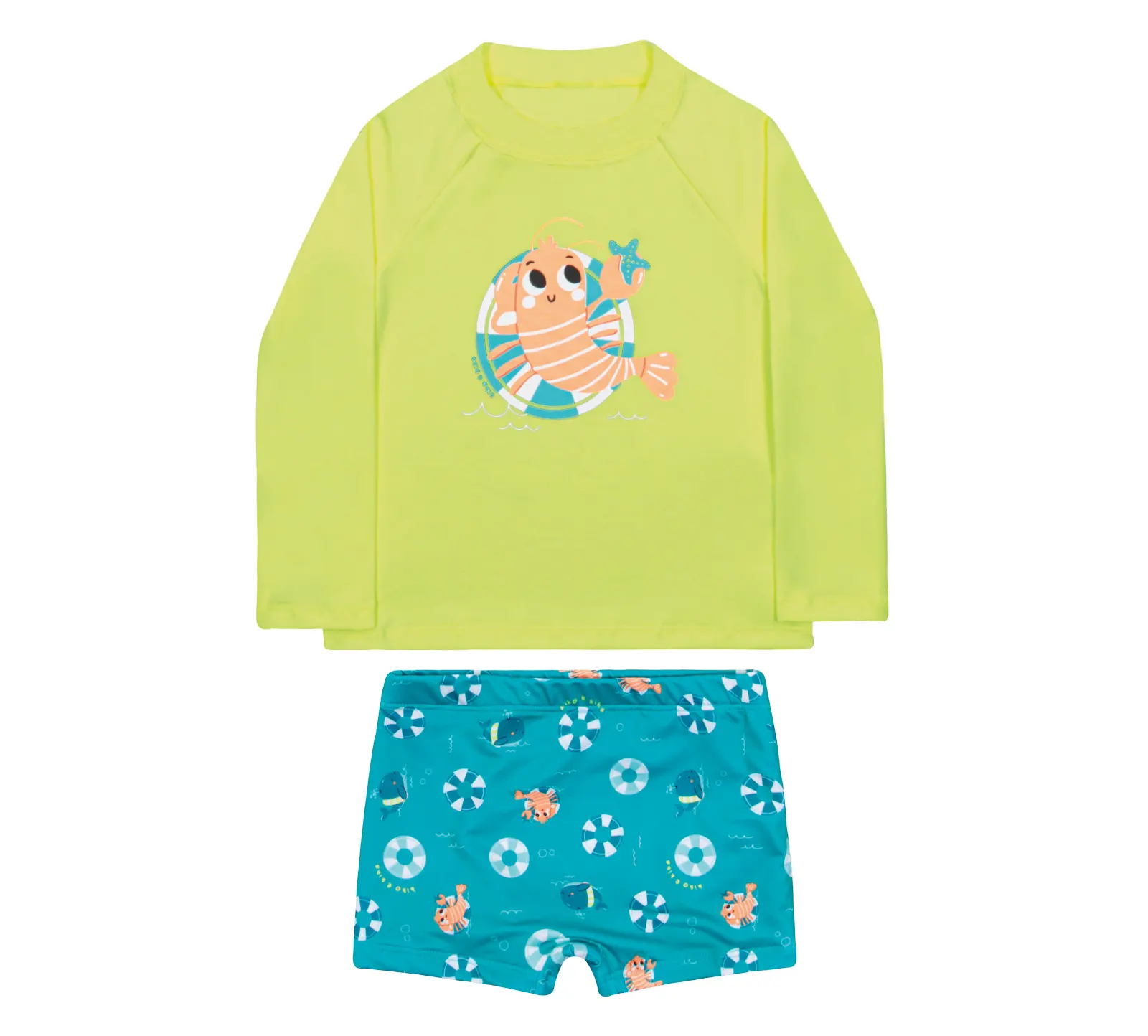Conjunto de praia ou piscina para bebê menino, composto por camiseta manga longa com proteção UV verde neon com estampa frontal e sunga estampada.