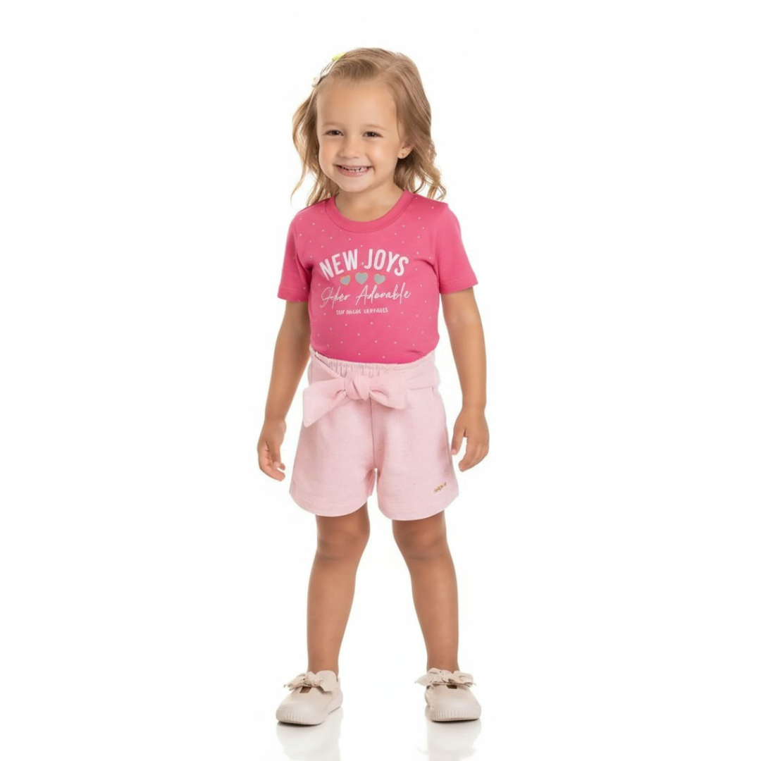 Conjunto para menina, composto por blusa manga curta rosa pink e short em moletinho com linho rosa claro com cintura de elástico e faixa para amarração. ATENÇÃO: confecção possui forma pequena, escolha um tamanho a mais.