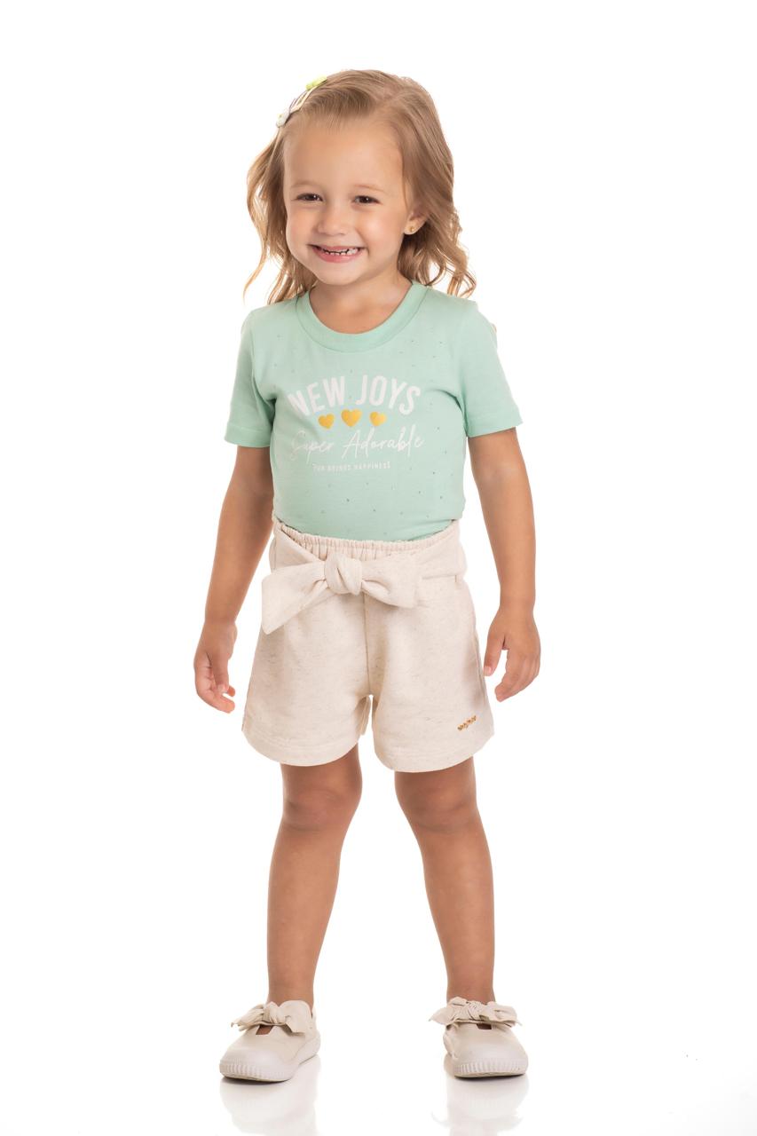 Conjunto para menina, composto por blusa manga curta verde claro e short em moletinho com linho cru com cintura de elástico e faixa para amarração. ATENÇÃO: confecção possui forma pequena, escolha um tamanho a mais.