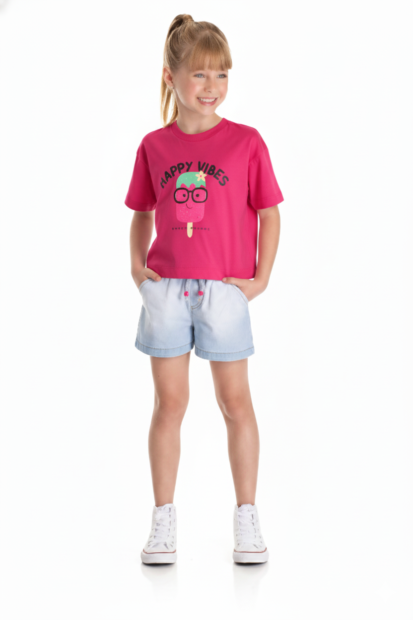 Conjunto para menina, composto por camiseta manga curta pink estilo cropped oversized com estampa frontal de melancia em alto relevo e short jeans chambray com cintura de elástico e cadarço para amarração com missanga pink.