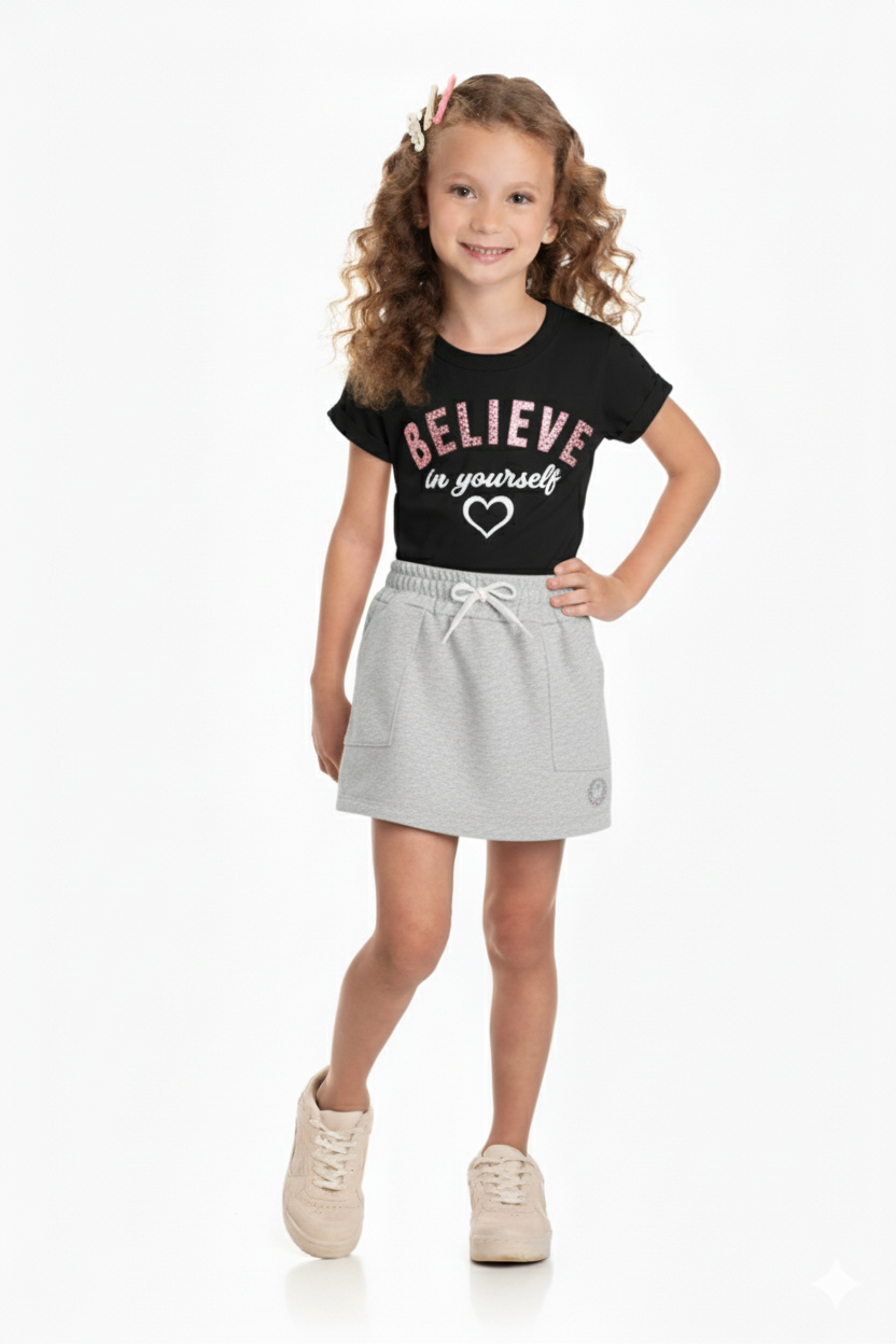 Conjunto para menina, composto por blusa manga curta preta com estampa escrita com pedrinhas de strass e short saia em malha cinza mescla claro com bolsos e cintura de elástico com cadarço para amarração. ATENÇÃO: confecção possui forma pequena, escolha um tamanho a mais.