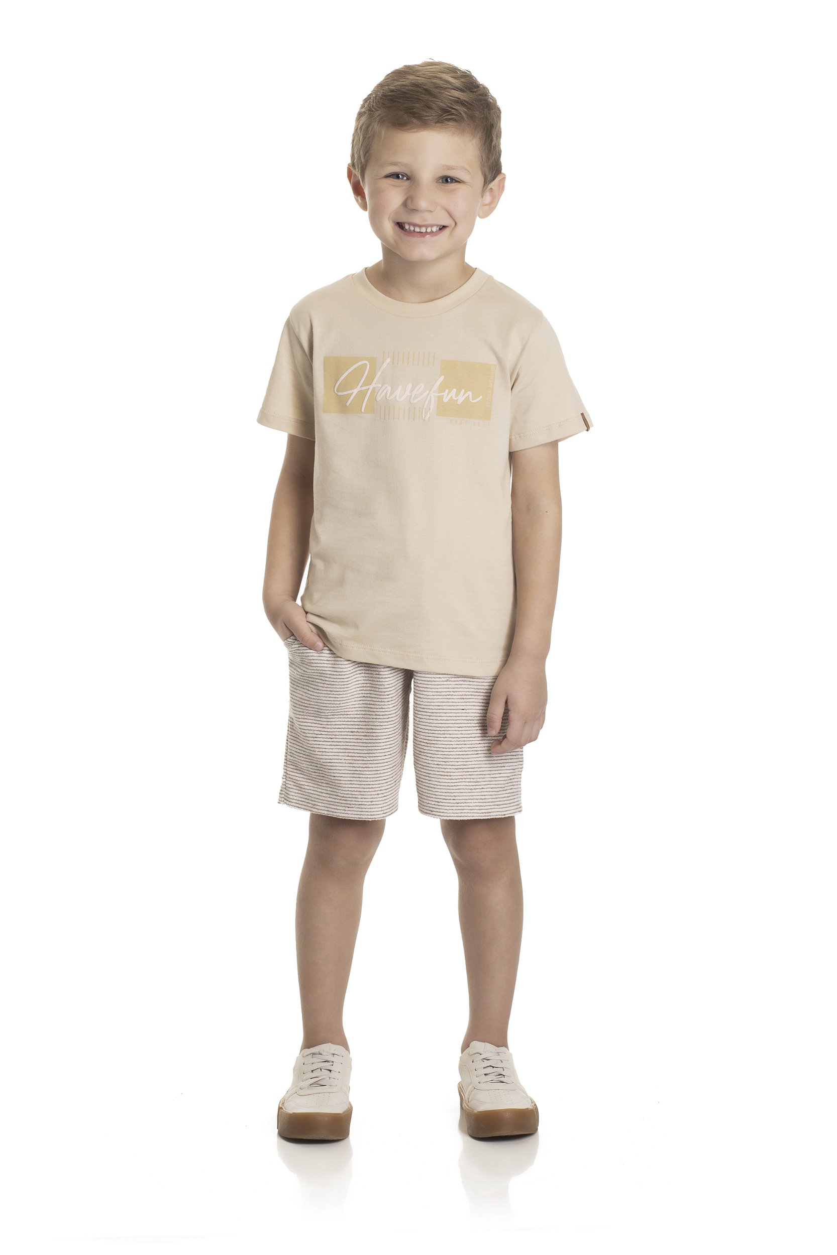 Conjunto infantil para menino, composto por camiseta manga curta bege com estampa frontal escrita Have Fun e bermuda em moletinho cru com listrado bege com cintura de elástico.