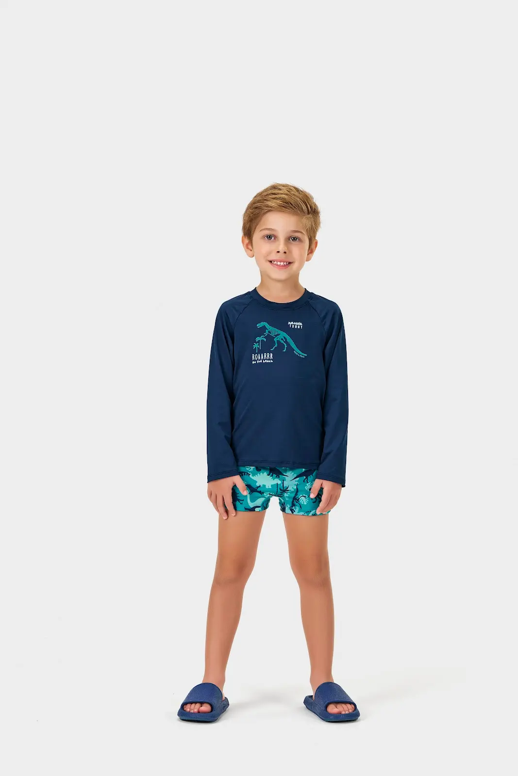 Conjunto de praia ou piscina para menino composto por camiseta manga longa com proteção UV azul marinho com estampa frontal e sunga estampada.