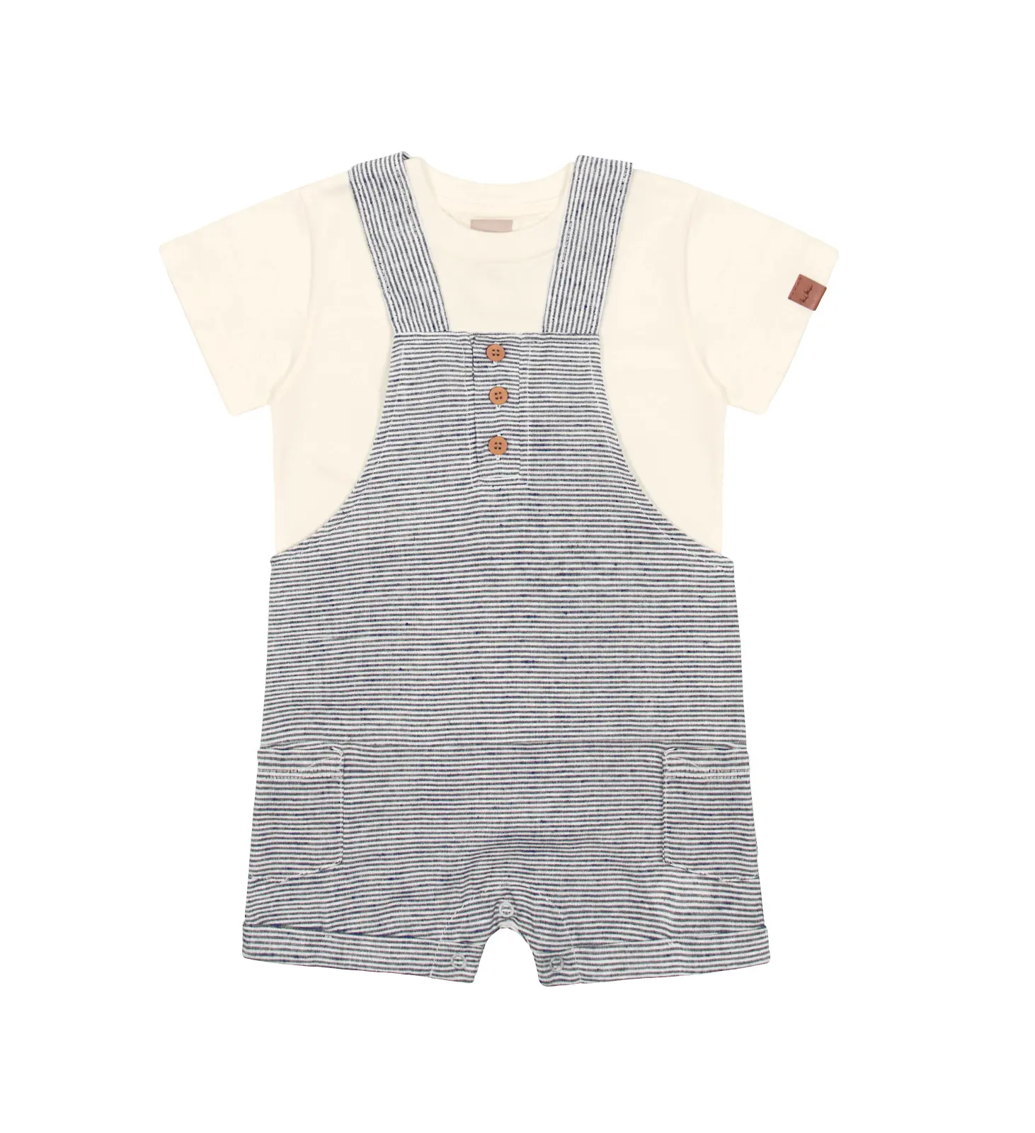 Conjunto para bebê menino com jardineira listrada e camiseta em meia malha branca. A jardineira é o grande destaque do look, trazendo alças com fechamento em botões e estampa listrada em toda a peça, conferindo modernidade ao visual. Além disso, um bordado exclusivo da marca deixa a jardineira ainda mais incrível, enquanto a camiseta básica de manga curta complementa o conjunto. Ideal para passeios e momentos especiais em família.
