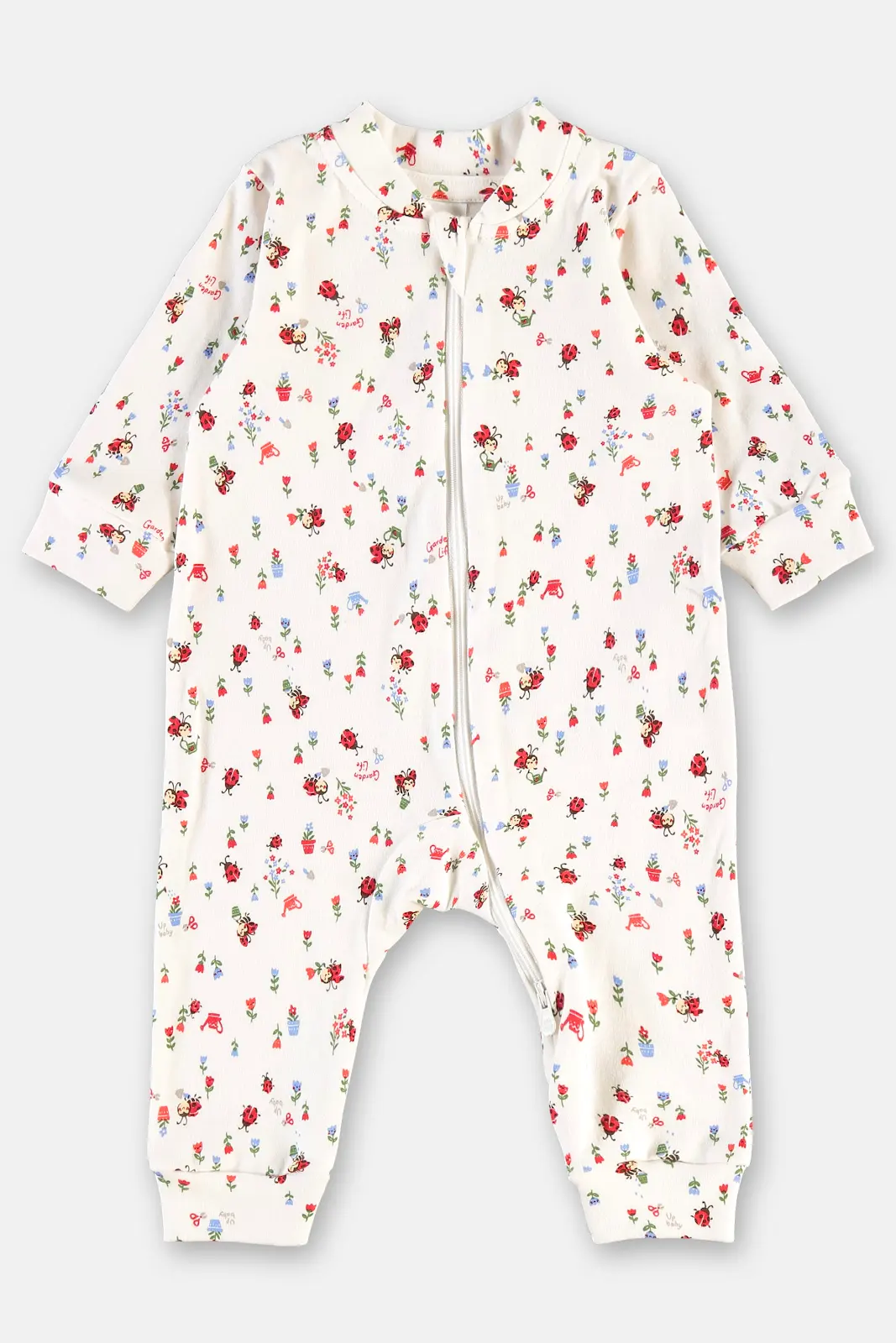 Macacão longo para bebê com zíper frontal com abertura em doiss entidos, faclitando a hora das trocas. É confeccionado em suedine macia e confortável para sua bebê menina. Possui estampa delicada de joaninhas vermelhas.