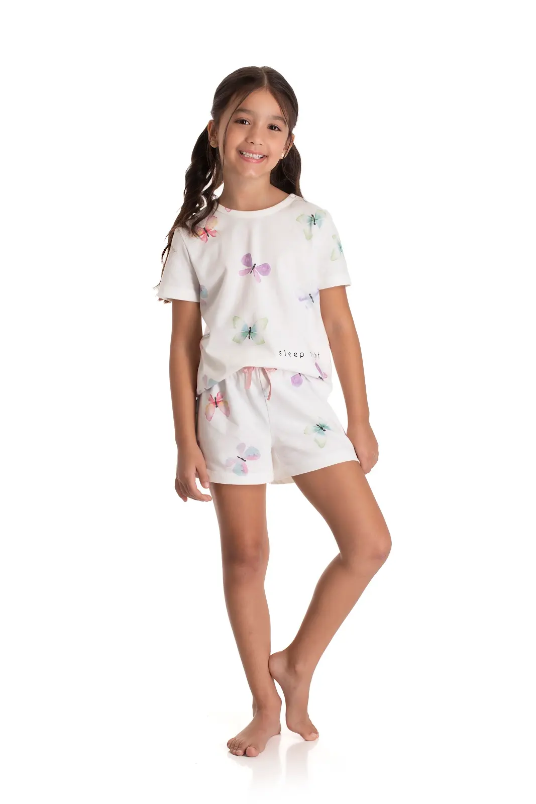 Pijama infantil feminino de manga curta em meia malha na cor branca com estampa de borboletas coloridas. Tecido macio e confortável, de ótima qualidade. Composto por camiseta e short com cintura de elástico e cadarço com lurex para amarração.