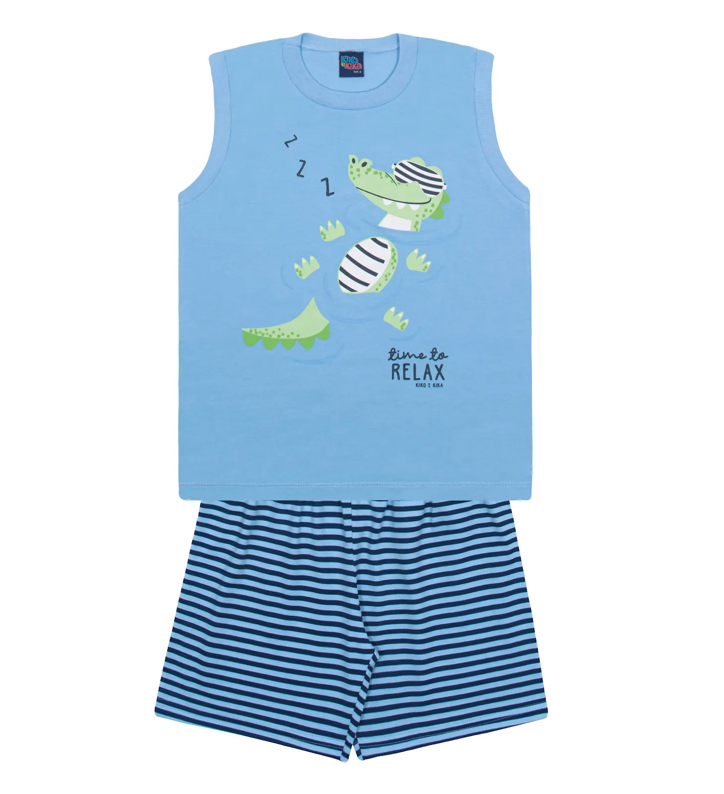 Pijama para menino com camiseta regata branca com estampa de jacaré e short em meia malha listrado com cinza. A regata possui gola redonda e é fresquinha, ideal para as noites quentes do verão. O short possui cintura de elástico confortável.