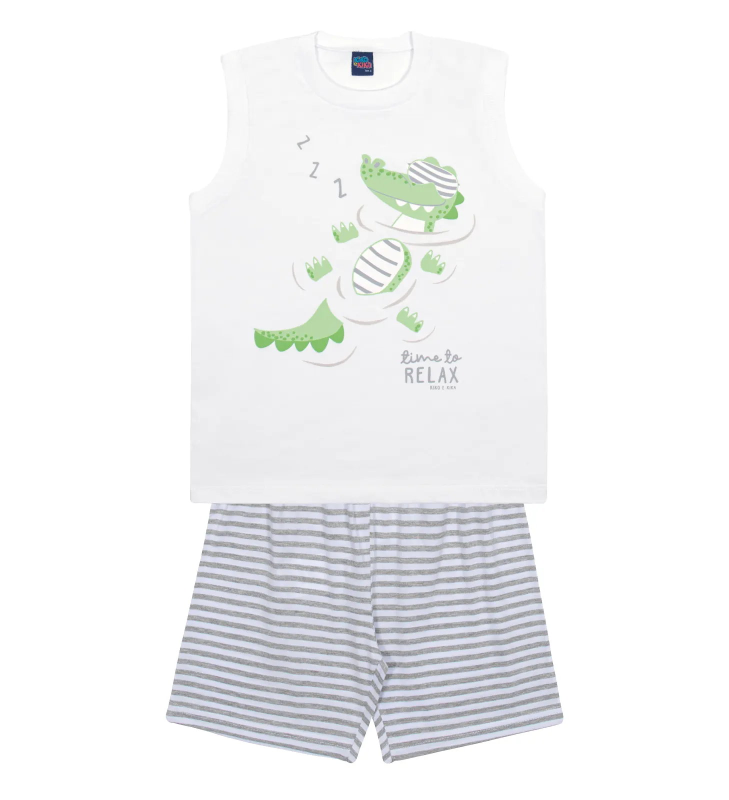 Pijama para menino com camiseta regata branca com estampa de jacaré e short em meia malha listrado com cinza. A regata possui gola redonda e é fresquinha, ideal para as noites quentes do verão. O short possui cintura de elástico confortável.