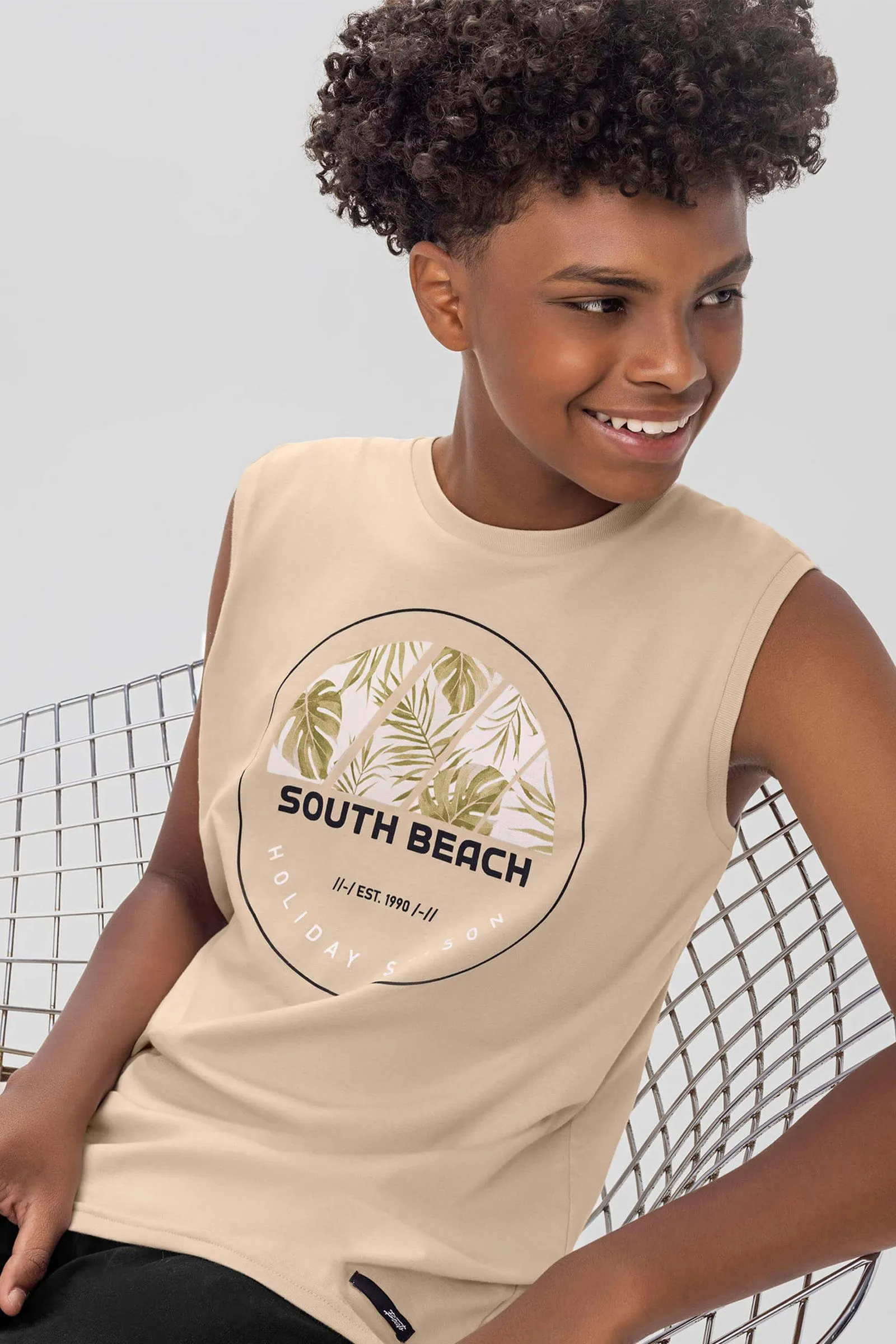 Regata Beats em meia malha juvenil para meninos, é conforto e possui toque leve para o dia a dia no verão. Com ombros mais largos e estampa frontal com elementos tropicais, essa peça combina facilmente com bermudas e calças. Ideal para produções despojadas e confortáveis, seja para um passeio com a galera ou um dia tranquilo em casa, essa peça é uma aposta certeira para quem curte o estilo urbano!