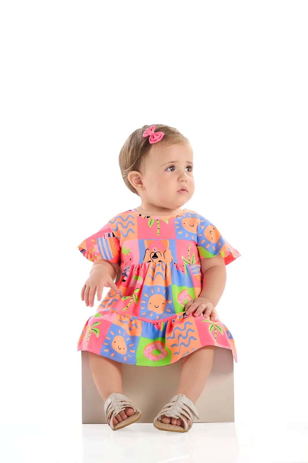 Vestido para menina estampado em meia malha rosa e laranja neon com manga curta e detalhe com babado no ombro. Possui estampa de bichinhos. Leve e confortável, ideal para passeios nos dias quentes de verão.