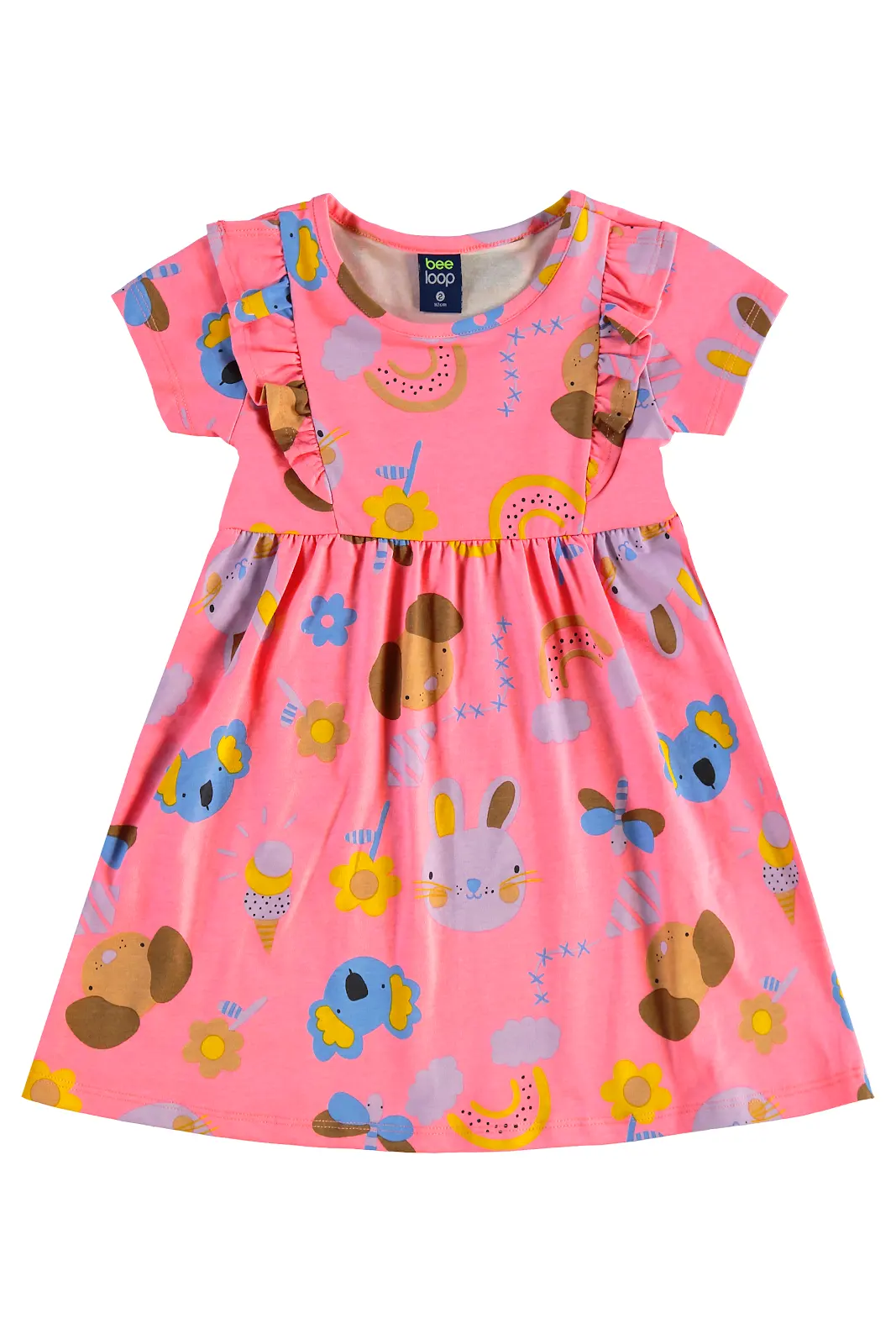 Vestido para menina estampado em meia malha rosa com manga curta e detalhe com babado no ombro. Possui estampa de bichinhos. Leve e confortável, ideal para passeios nos dias quentes de verão.