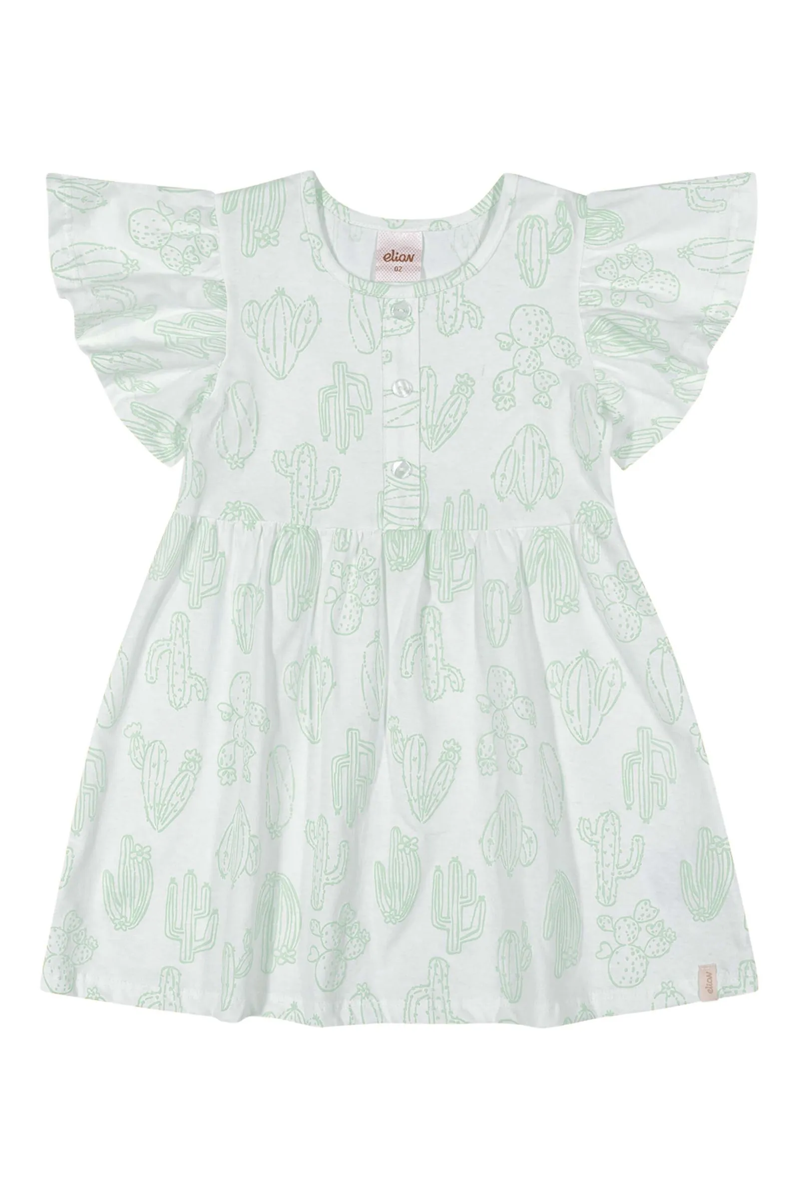 Vestido infantil manga curta , confeccionado em malha verde água de modelagem mais soltinha, leve e frsquinho para os dias de sol no verão. Suas mangas curtas com leve franzido nos ombros e recorte formando a saia garantem movimento ao look, enquanto detalhes com botões dão um charme especial para o visual. A estampa de cactos por toda a peça combina perfeitamente diversão e estilo, se tornando ideal para passeio, encontros em família ou festinhas. Esse vestidinho é a aposta certa para deixar sua menina ainda mais linda!